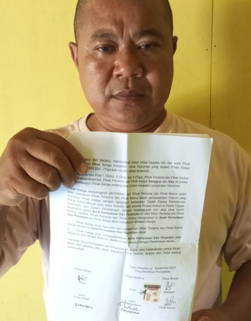 Berdasarkan salinan perjanjian bermaterai yang ditunjukkan Rizal, tercantum pengakuan keterlibatan Yusri dan Amirudin dalam distribusi solar bersubsidi yang kemudian ditimbun oleh Rizal.
