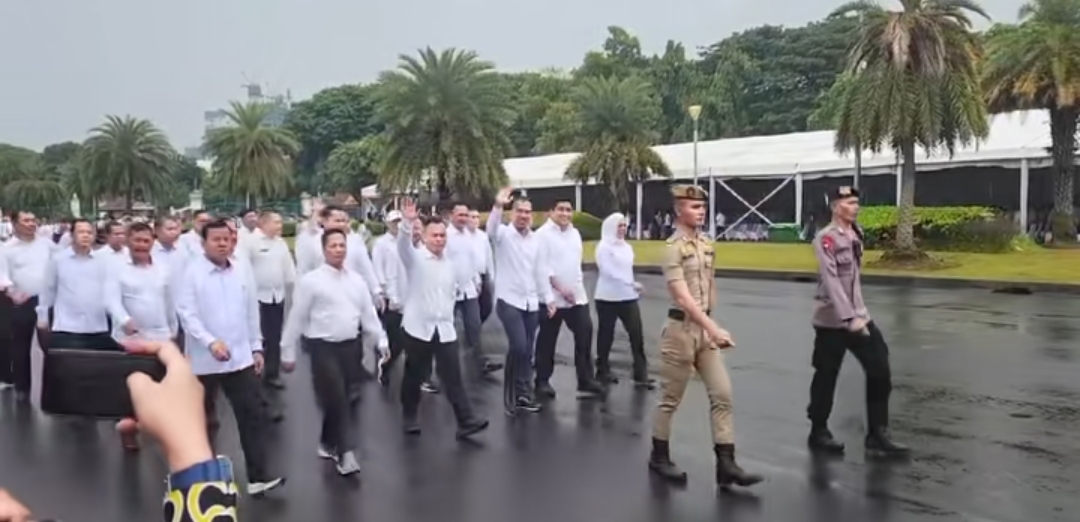 Keduanya tampak mengenakan kemeja putih, seragam dengan para pemimpin daerah lainnya yang akan dilantik.